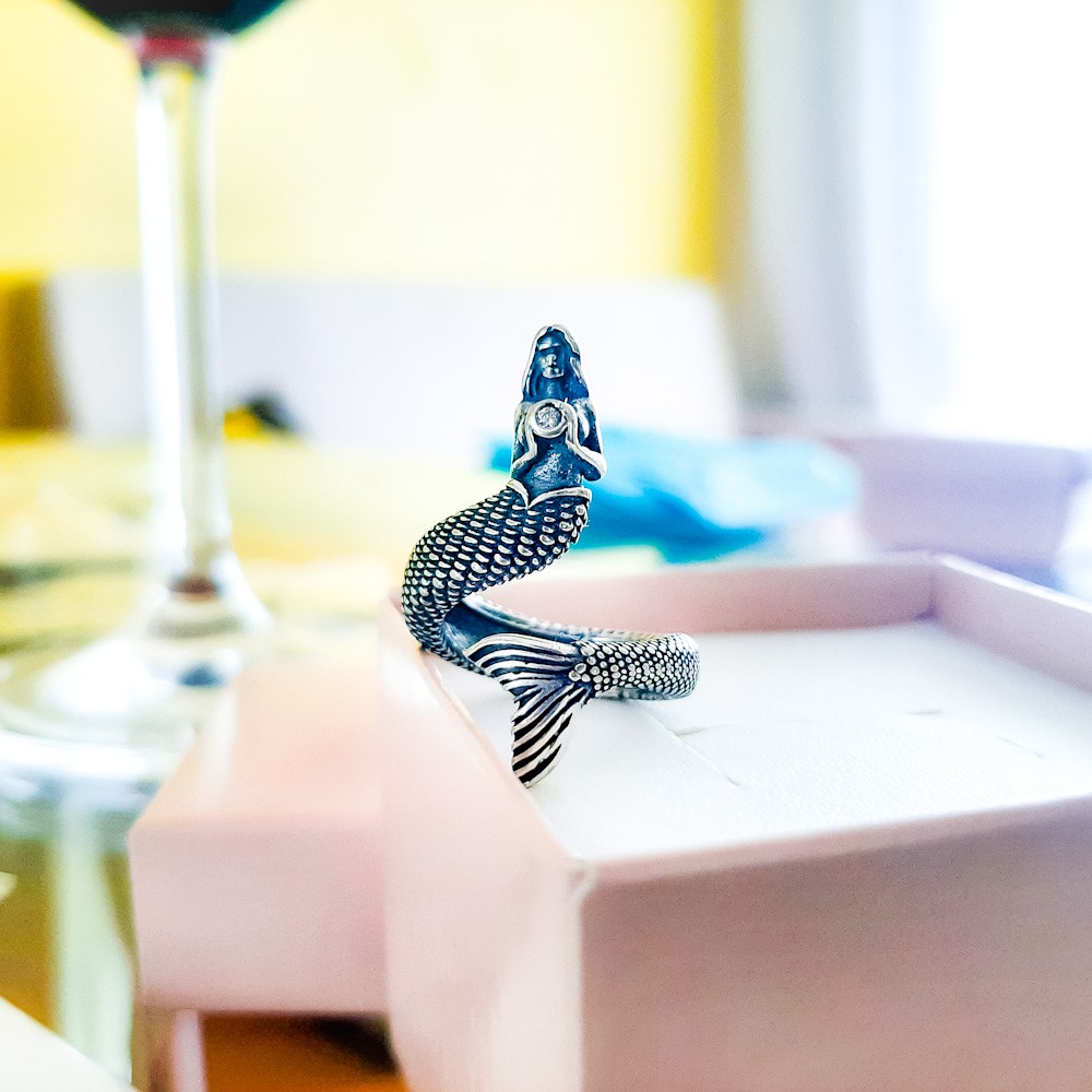 Trata-se de uma joia exclusiva, cheia de detalhes e seu tamanho base é 15, já que pode ser ajustado para tamanhos próximos com cautela. A joia ainda leva uma pequena pedra de zircônia no pote da Sereia simulando um diamante.